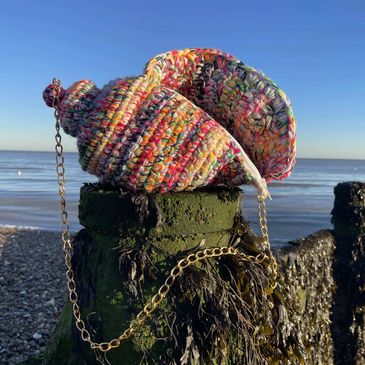 I crochet shell-inspired accessories from washed up fishing rope, nets and line and create Plarn by cutting plastic bags into loops and joining them together into a continuous strip to make a yarn material that is surprisingly strong and versatile.